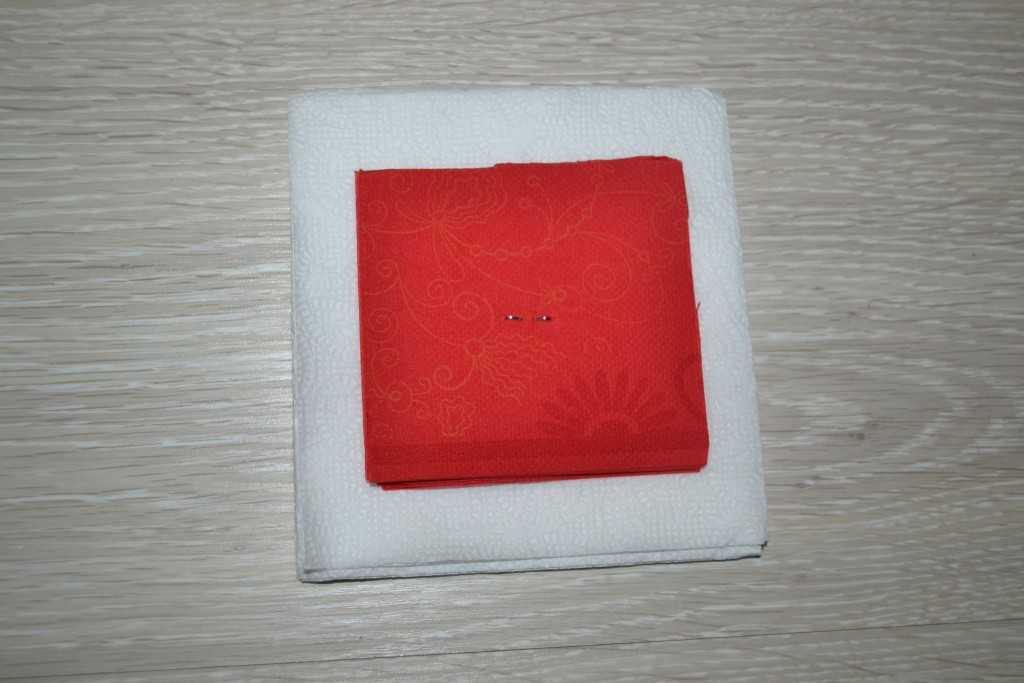 Из салфеток белого цвета делаем такие же заготовки. В данном случае они немного больше по размеру, поэтому обрезаем их, чтобы они стали такими же, как красные.