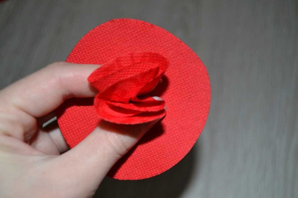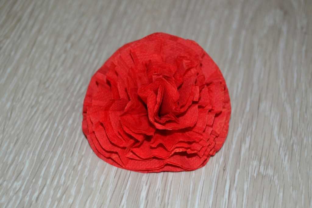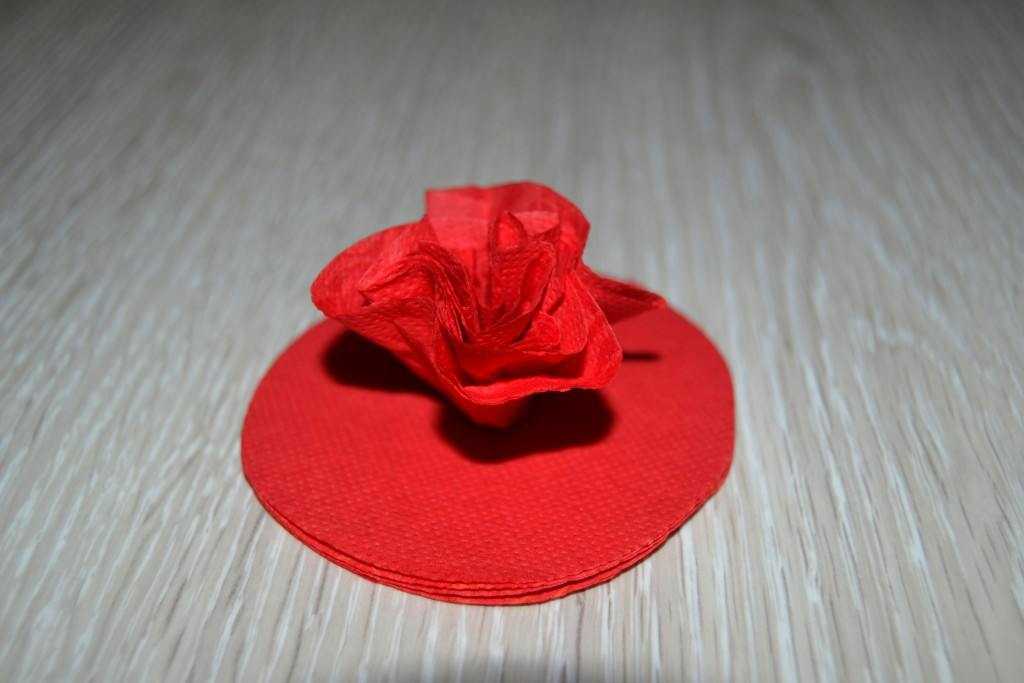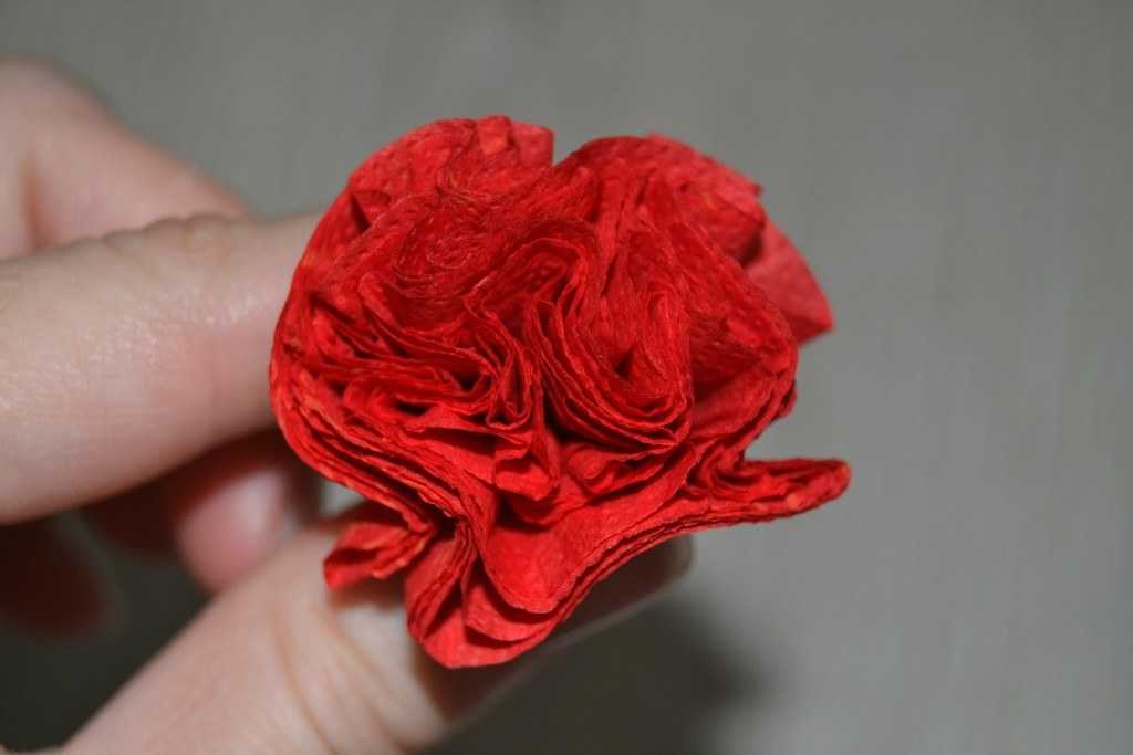 - Начните стягивать края каждого слоя салфеток к центру, один за другим, двигаясь по кругу. Должен получиться пушистый бутон. Сделайте необходимое количество цветов, ориентируясь на размеры картонной заготовки.