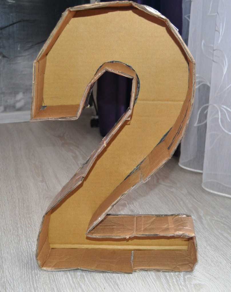 Вырезаем цифру в двойном экземпляре. Из оставшегося картона вырезаем полоски одинаковой ширины. Они понадобятся для формирования боковых частей.