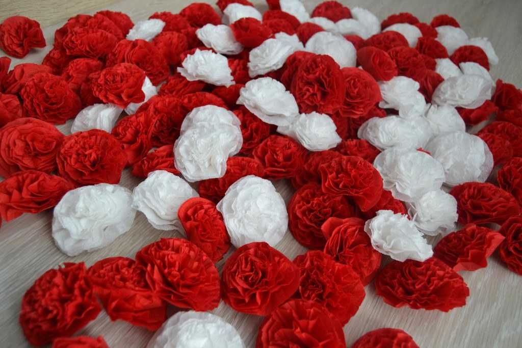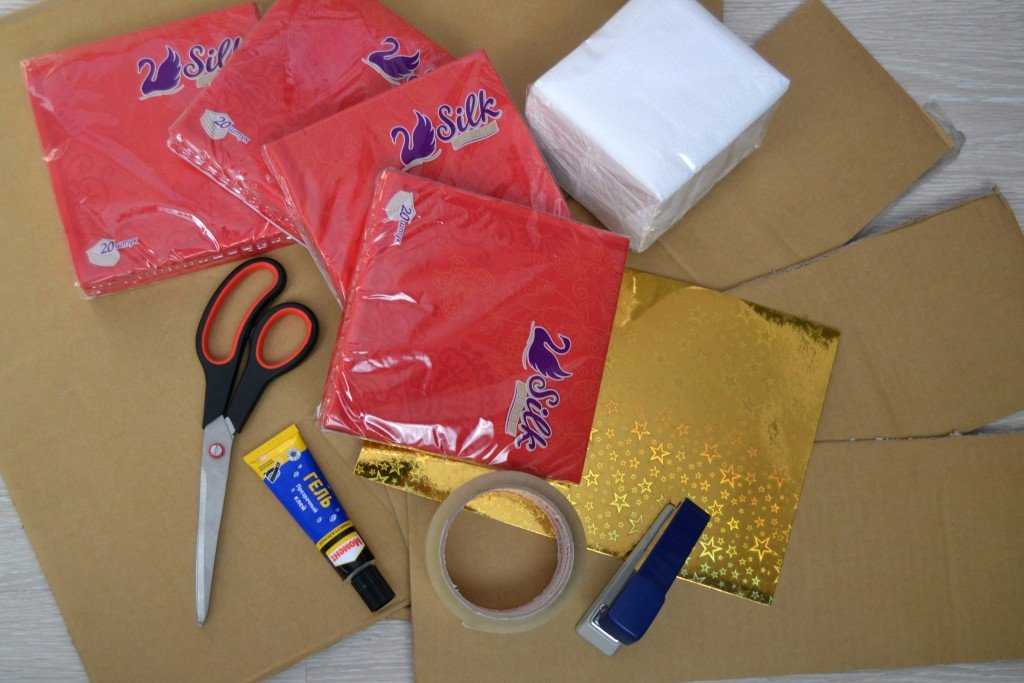 Теперь настало время приготовить декор для единички из салфеток. Если вы используете папиросную или гофрированную бумагу, возьмите 2-3 рулона. Салфеток понадобится несколько пачек, в зависимости от того, насколько объёмными вы сделаете цветы.