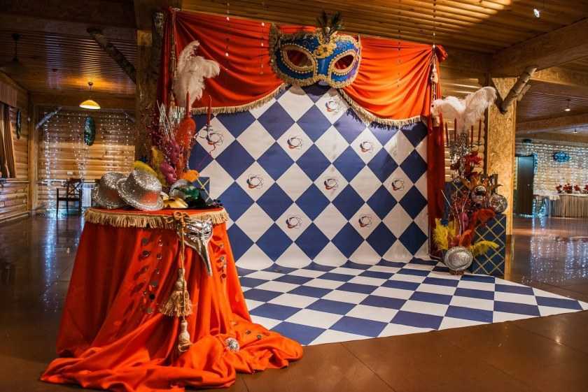 Такой вариант выбирают ради экономии. С одной стороны — это красивое тематическое оформление сцены во время официальной части или развлекательной программы. С другой — эффектная фотозона, которая хорошо освещена верхними и нижними софитами. Минус тут один — фотографироваться надо после мероприятия, не у всех хватает терпения дождаться своей очереди.