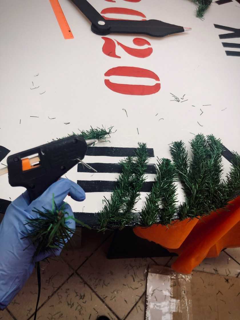 Для того, чтобы закрепить декоративные элементы, клеим кусочки скотча на стену, и уже на него «сажаем» веера с помощью клеевого пистолета.