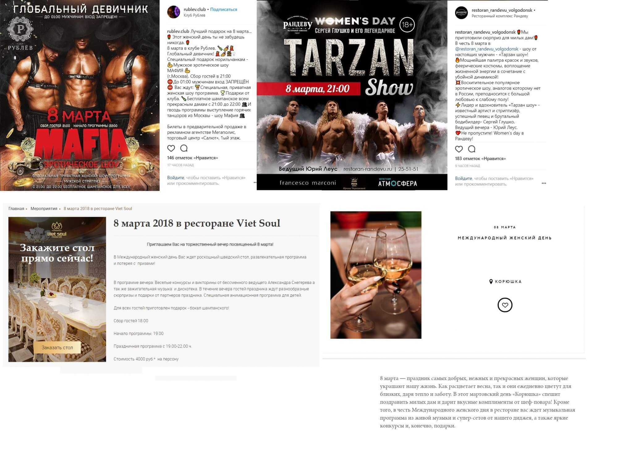 В эти дни повышенным спросом пользуются концерты, постановки и развлекательные мероприятия, посвященные женщинам или сделанные с расчетом на них. Предложите гостям бесплатный бокал шампанского или небольшой мастер-класс, чтобы вызвать отклик и заинтересовать публику.