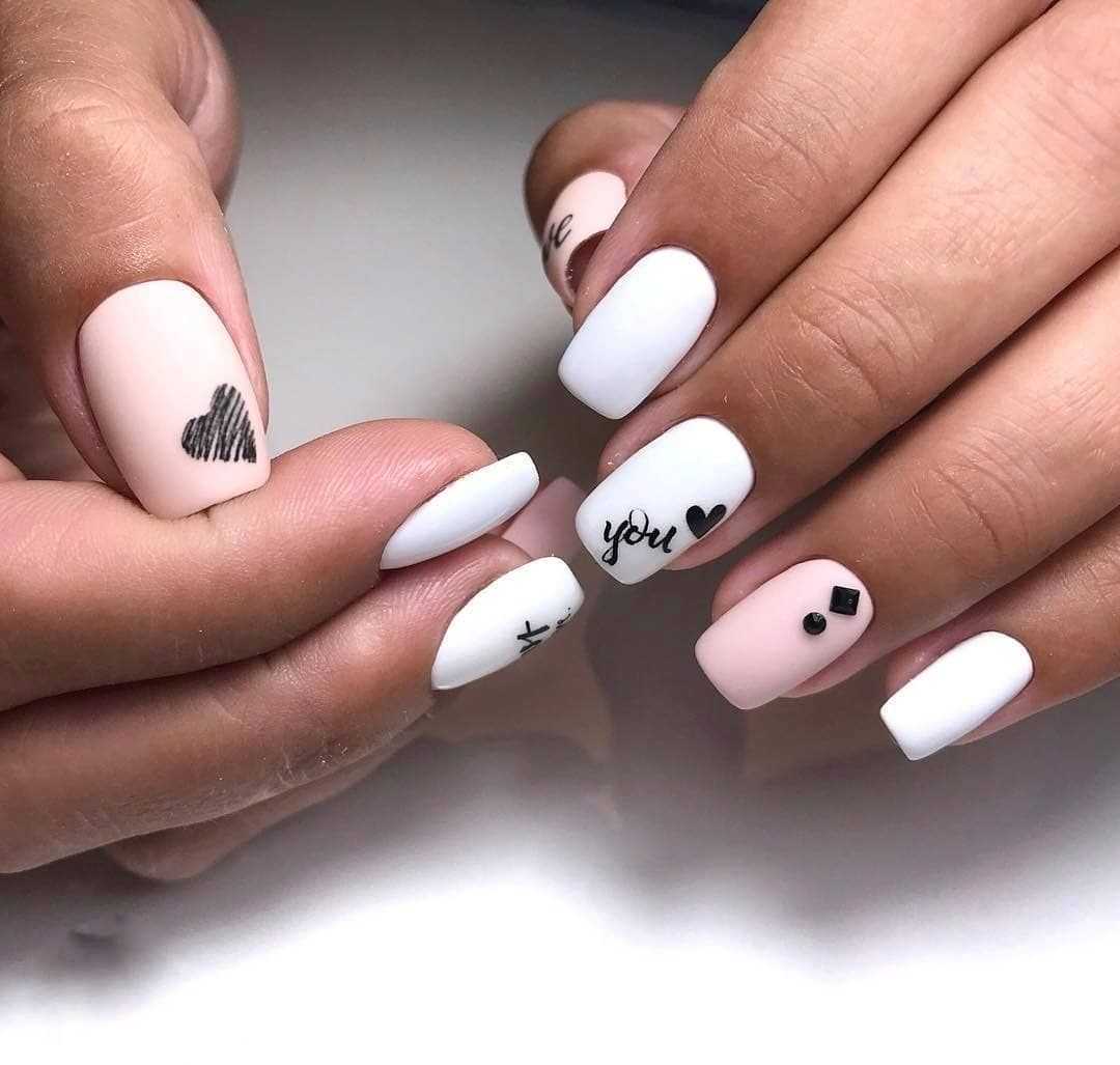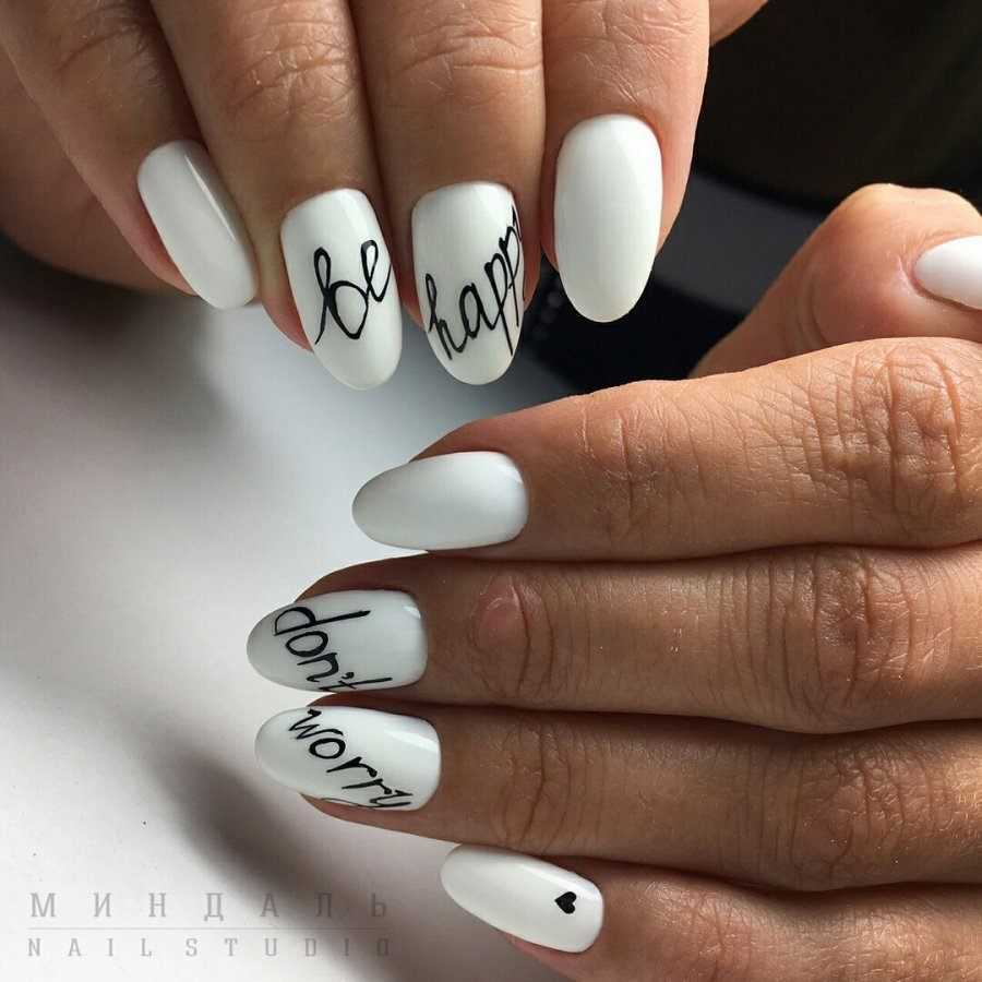 Что касается надписей, то тут также нет никаких ограничений. Создавайте монохромные нейл-арты с черным гель-лаком или выполните надписи яркими оттенками. Белый маникюр с надписями, в отличии от остальных, можно дополнить флористикой, полосками, треугольниками, фольгой, стразами и другим декором. Белый дизайн ногтей – отличный вариант для летнего образа.