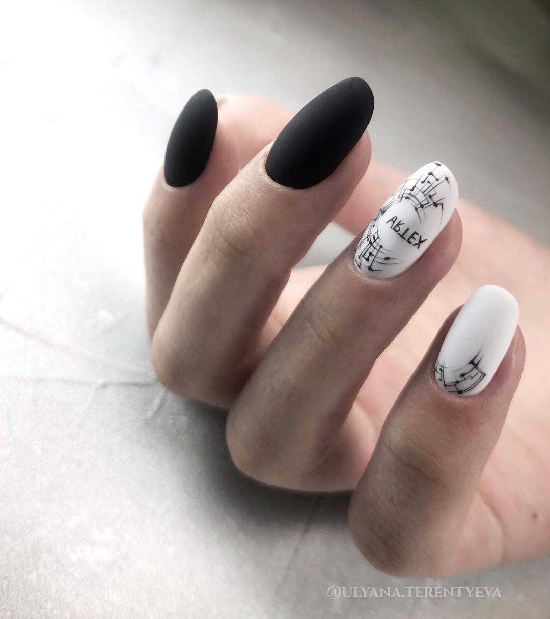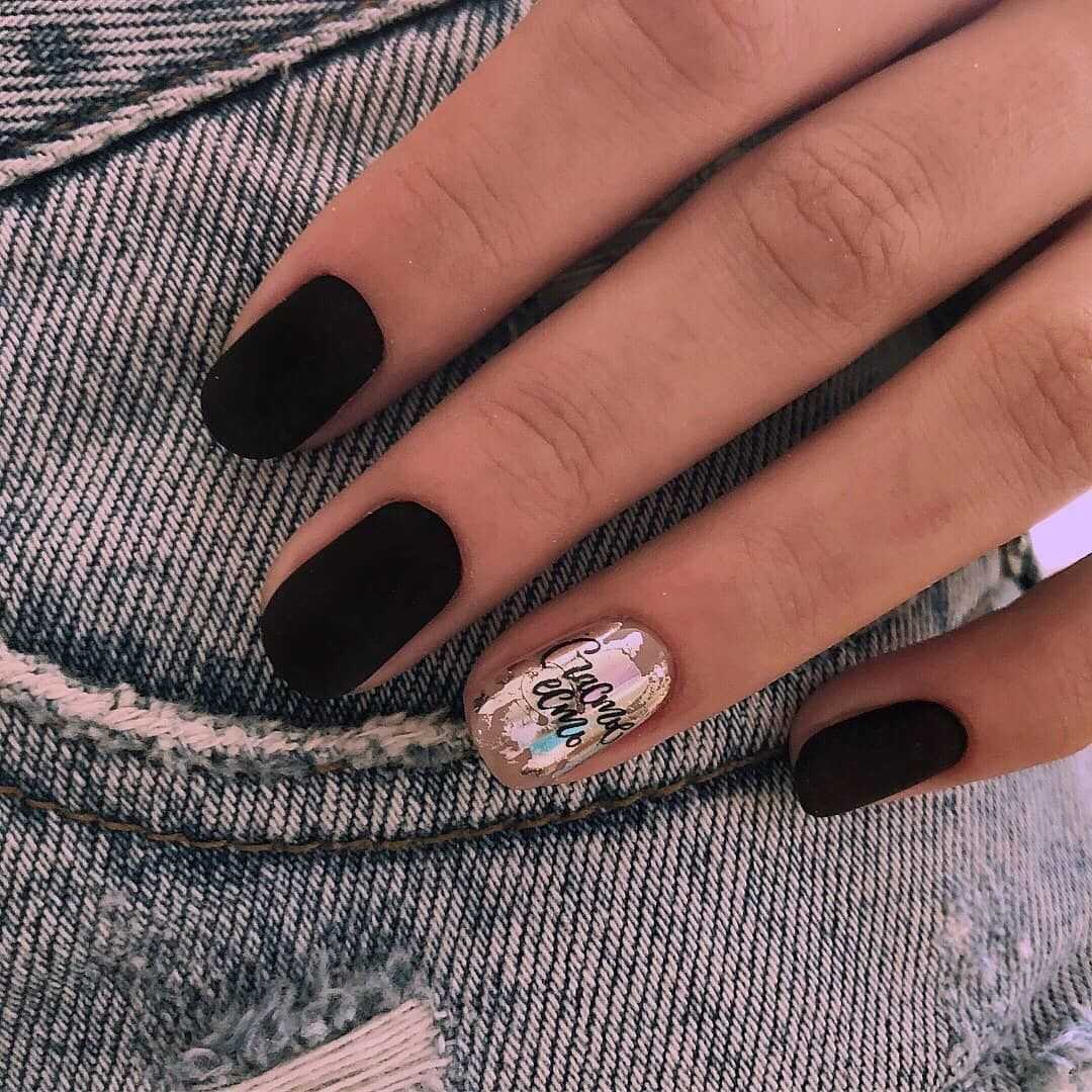 Несмотря на все разнообразие шрифтов и надписей, многим гораздо больше нравится минимализм. Это прекрасный вариант для любого случая, начиная с работы и заканчивая вечеринкой. Как известно, красота в простоте. Поэтому смело делайте однотонное покрытие с небольшой, красивой фразой или словом. В данном случае лучше всего выбирать нейтральный тона, такие как беж, черный, белый, серый или синий. Надпись можно сделать самостоятельно или же использовать специальные наклейки. Смотрится такой дизайн всегда особенно красиво и современно независимо от длины и формы ногтей.