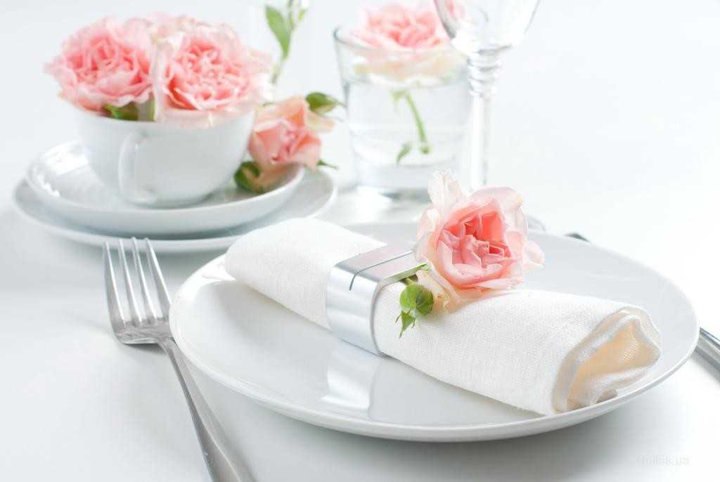 Подчеркнуть важность мероприятия помогут красиво оформленные салфетки у тарелки. Они могут располагаться в бокале, на блюде