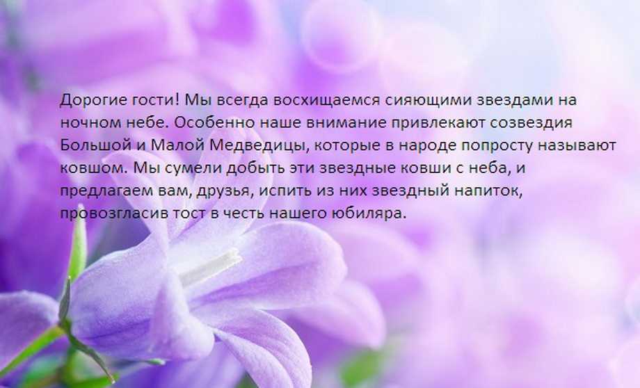 - Ну и что? Готовы ли вы открыть грандиозное представление под названием – Юбилей? Именно сегодня на небе светят звезды ради уважаемого юбиляра – (имя). Вы готовы отмечать все вместе (число) лет да так, чтобы юбиляр вспоминал этот веселый день до последних своих лет жизни?