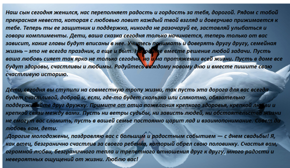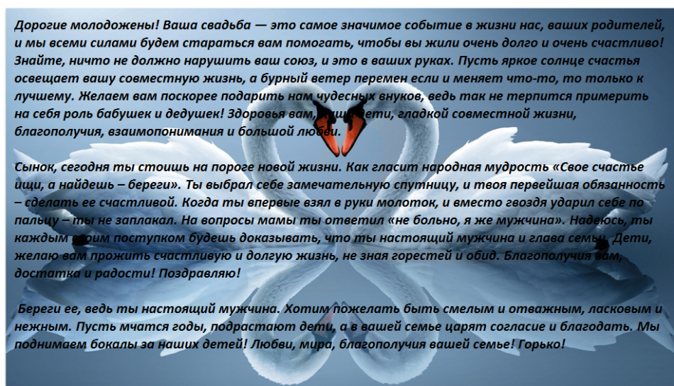 Дорогие муж и жена, сегодня вы не просто обменялись кольцами и клятвами, а приняли решение жить одной семьей. Помните, что семья – это не просто печать на бумаге, это любовь, уважение и верность. Сынок, страшно осознавать, но как быстро ты вырос! Ты уже не мальчик, а мужчина, глава семьи и опора для своей супруги. Будь опорой для своей любимой женщины, береги ее и лелей. Тогда на ее сердце останется прекрасным бутоном и не покроется шипами. Доченька, будь верной спутницей своему мужу, направляй его и дари свою поддержку. Мы уверены, что, если вместе у вас все получится и вы осуществите свои желания. Пусть ваш дом будет полной чашей, в нем не утихает смех, а любовь даже через 50 лет будет гореть в ваших сердцах. Всего вам наилучшего, дети! Горько!