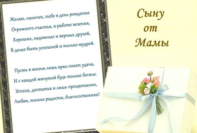 Желая сделать сыну сюрприз, мама может приготовить ему поздравительные куплеты. Чем младше ребенок, тем короче должны быть стихи сыну от мамы. Сначала — это шуточные четверостишья с наставлениями быть послушным. С возрастом в стихах увеличивается вложенная мудрость и количество строк. Чем старше ребенок, тем серьезнее становятся пожелания.