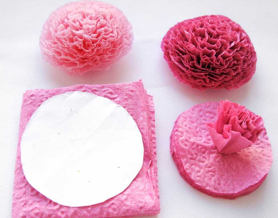 Так же есть метод создания полностью объемных цветов. Для этого возьмите ткань или салфетки и сложите их гармошкой много раз, и несколько таких сложенных салфеток нужно связать ниткой посередине, чтобы будущие лепестки «распушились».