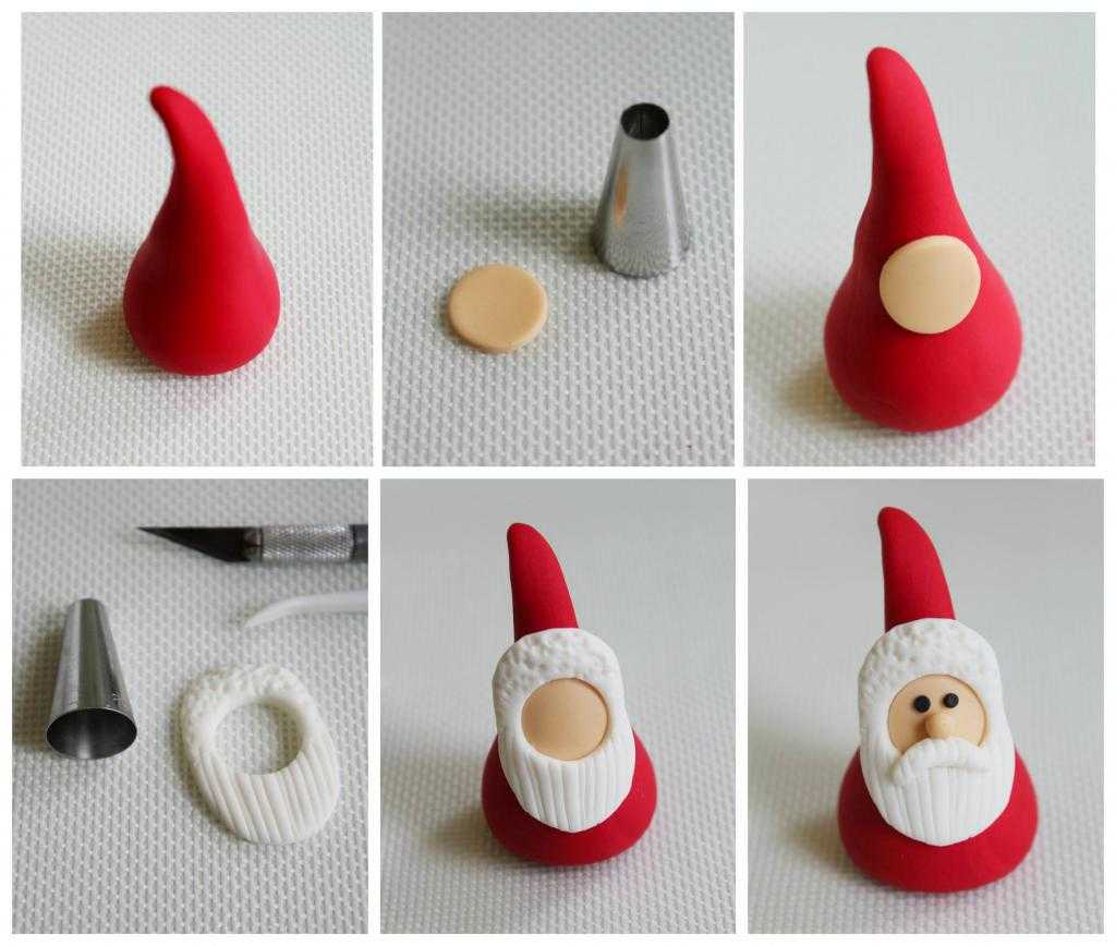 Не знаете, как развлечь ребенка. Как легко слепить из пластилина Деда Мороза? Сформируйте из красного пластилина шар, а затем преобразуйте его в конус. Раскатайте два пласта – один белый, другой красный. С помощью наперстка вырежьте волшебнику лицо. Установите его в той части заготовки, которая начинает идти на сужение. Из белого пласта нужно вырезать силуэт бороды. С помощью наперстка проделайте отверстие в верхней части бороды. Стеком нанесите на бороду рельеф. Вы можете нижнюю часть заготовки декорировать полосками, а верхнюю – точками. Наденьте бороду на лицо и хорошо пригладьте стык. Из оставшегося пласта вырежьте усы, декорируйте их и прикрепите к нижней части лица. Остается слепить нос и глаза.
