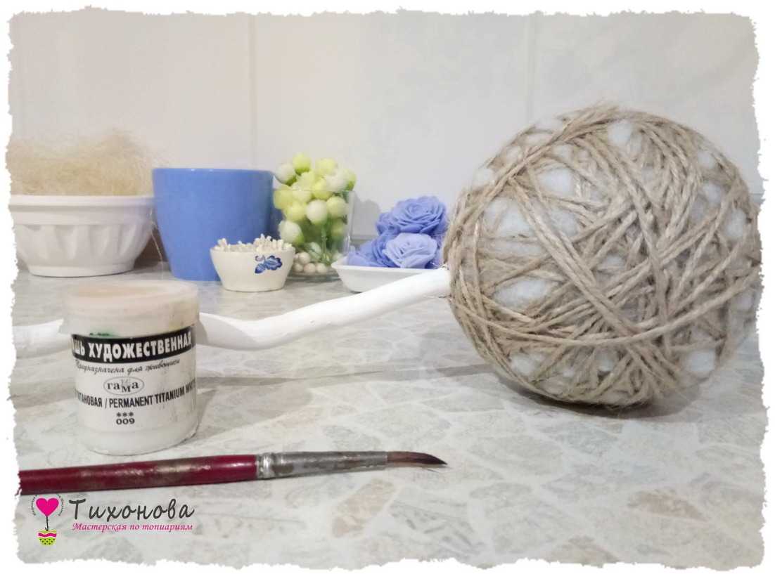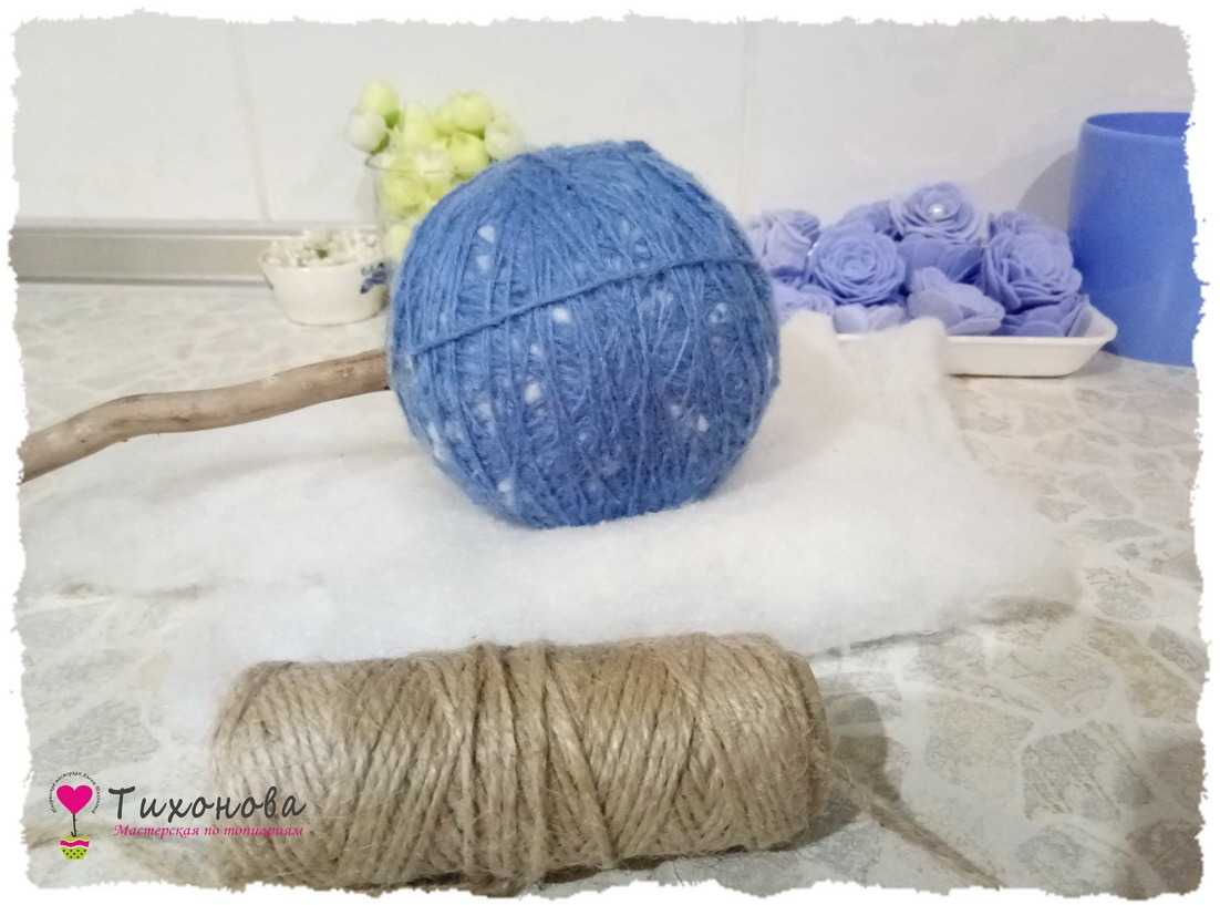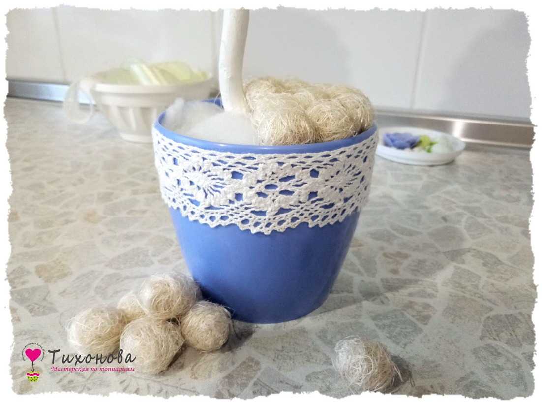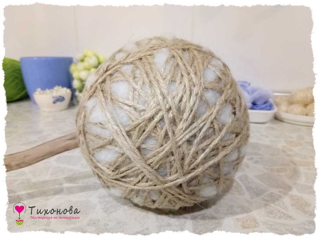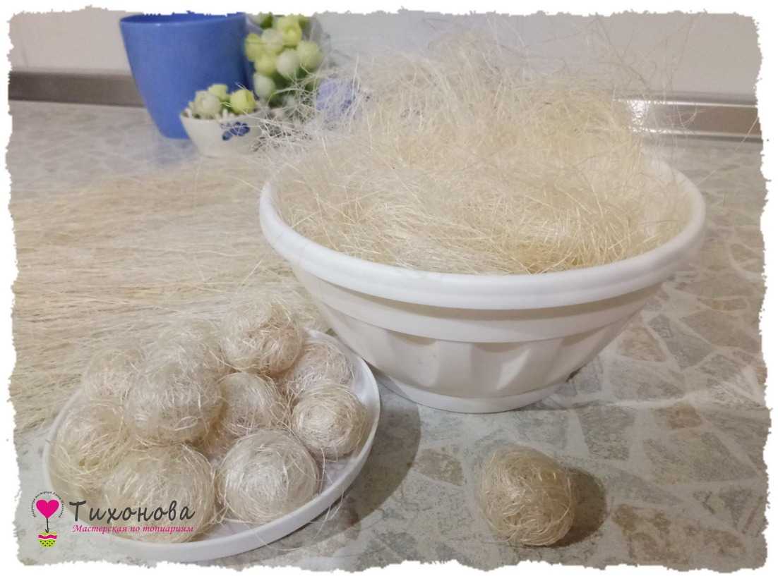 На топиарий из салфеток также необходимо заранее сделать шарики из сизаля. Используем волокно молочного цвета, скручиваем 33 шарика среднего диаметра для кроны. Также понадобится 20 шариков в 2 раза меньше по диаметру — для заполнения горшка. Подробная инструкция с видео, как делать сизалевые шарики.