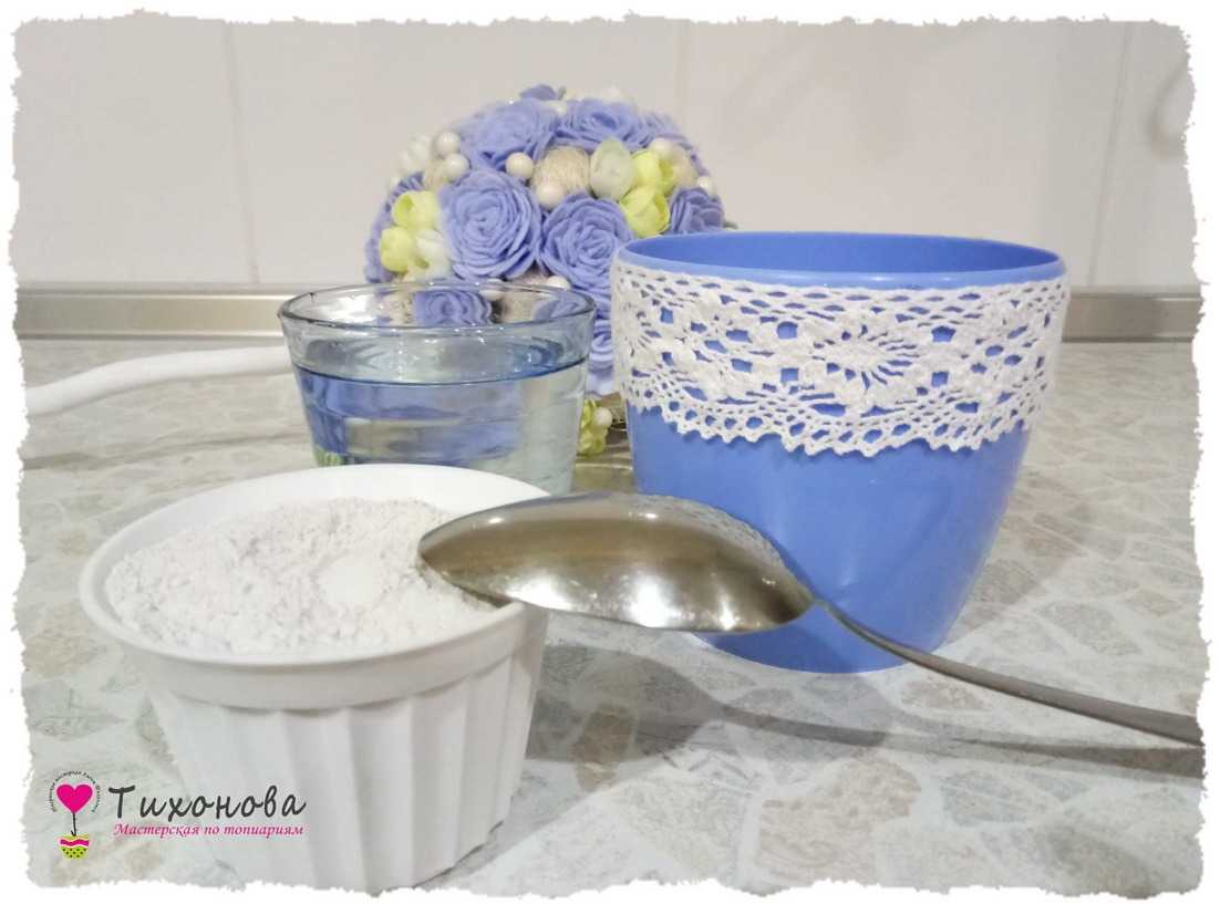 Непосредственно в горшке замешиваем раствор: 2 части гипса, 1 часть воды. Медленно доливая воду, вымешиваем смесь до консистенции густой сметаны и так, чтобы получилось немного больше половины горшка. В раствор опускаем несколько кусочков пенопласта или губки, чтобы при расширении гипс не расколол горшок. Садим топиарий в правильном по композиции положении.