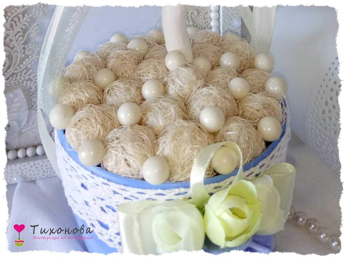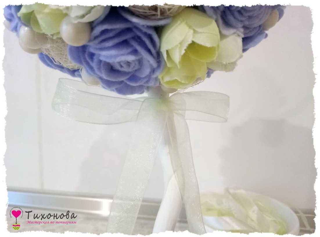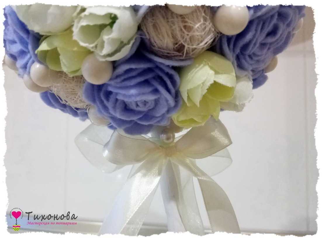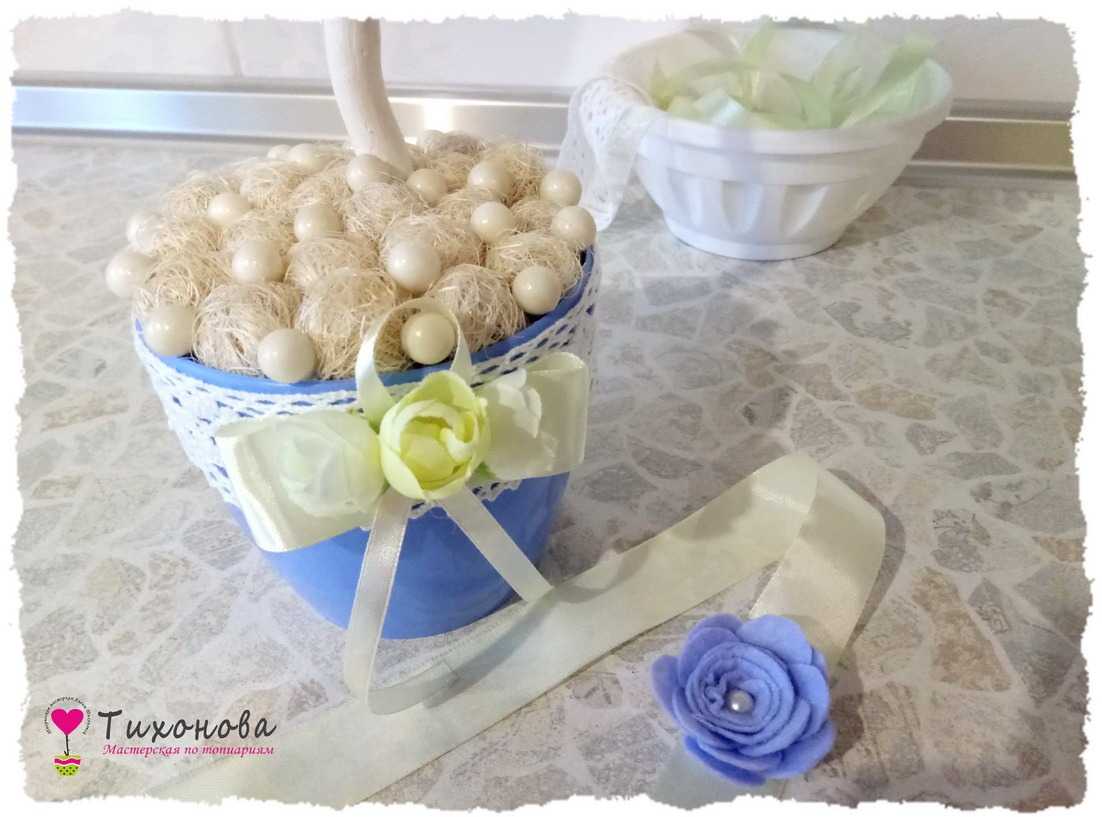Последний штрих — двойной бант из органзы и атласной ленты, повязанный на ствол топиария из салфеток «Небесная гармония».