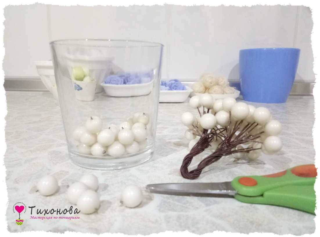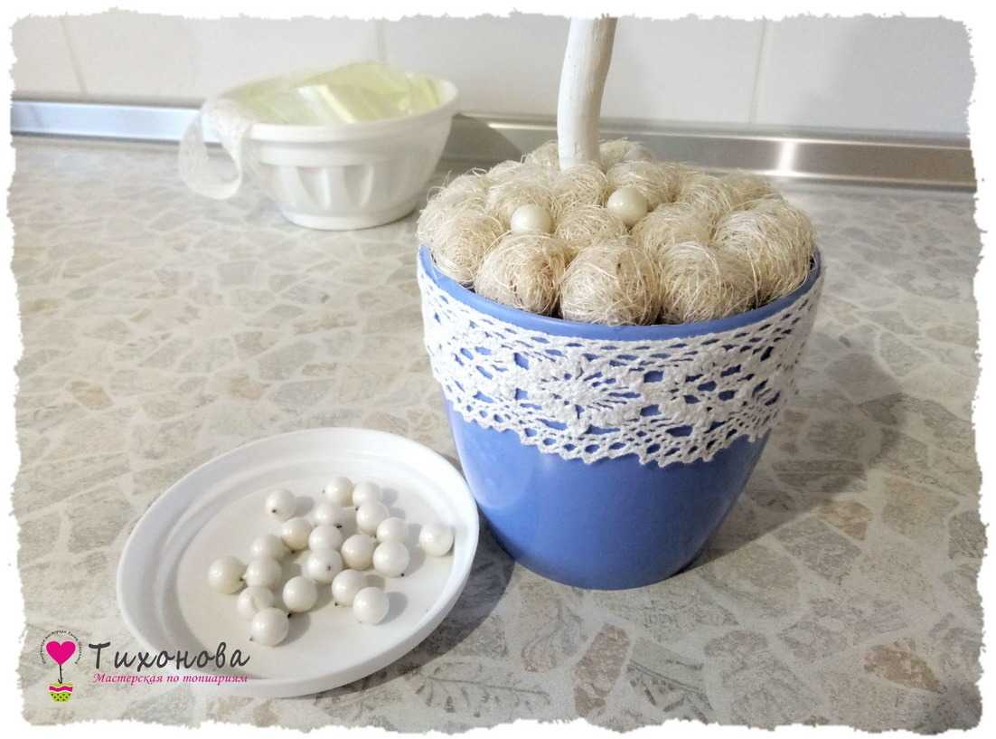 При желании в крону добавляются перламутровые бусины, а ствол обвивается нитью жемчуга. Топиарий готов.
