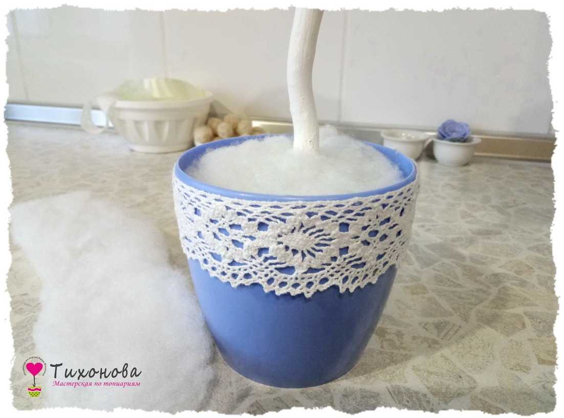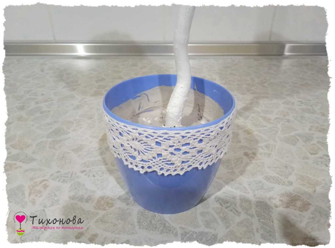 До заливки топиария гипсом приклеиваем на горшок кружево, по кромке. Также не забудьте тщательно заклеить дренажное отверстие, если используется цветочное кашпо.