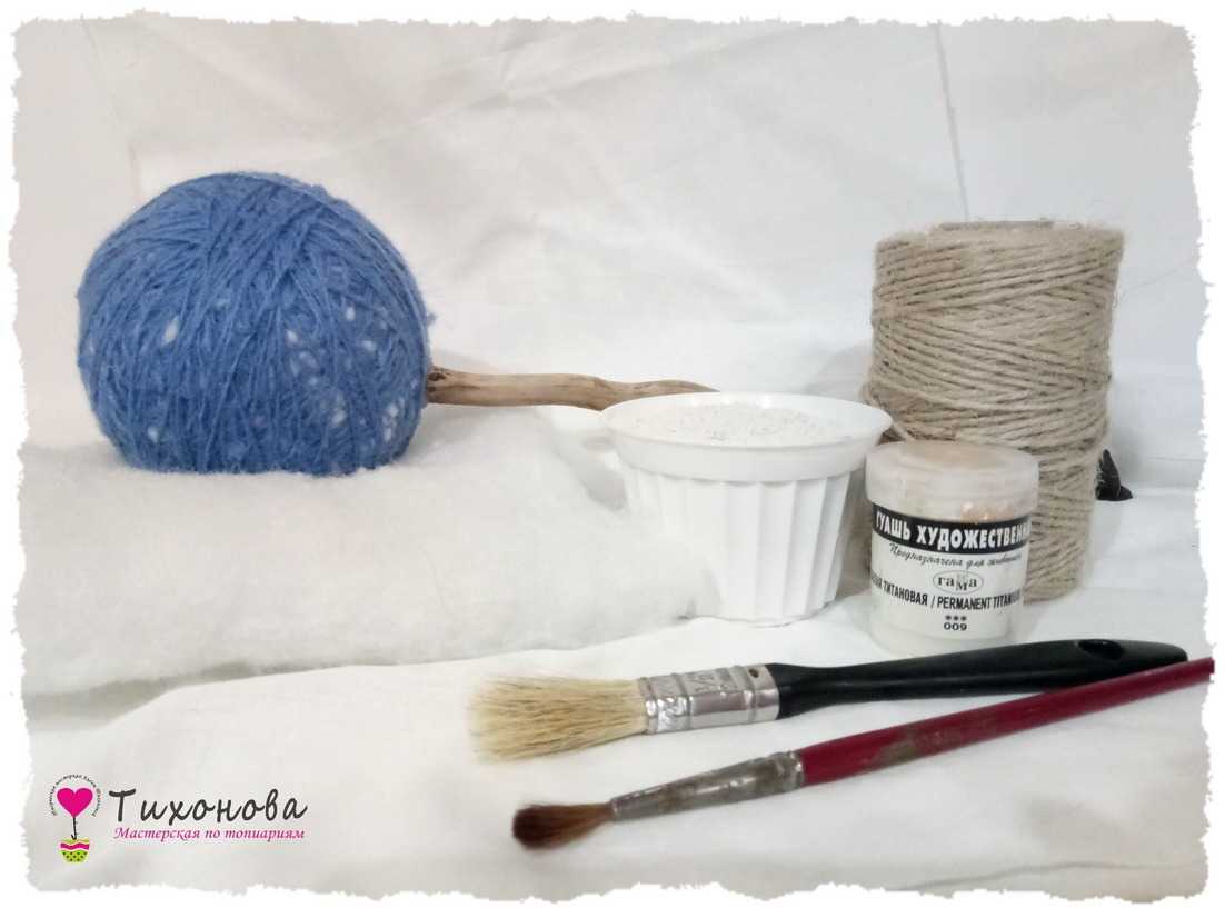 В баночке из-под йогурта разводится гипсовая смесь. По густоте состав должен напоминать сметану. Ствол деревца вставляется в центр емкости. Композиция оставляется на просушку.