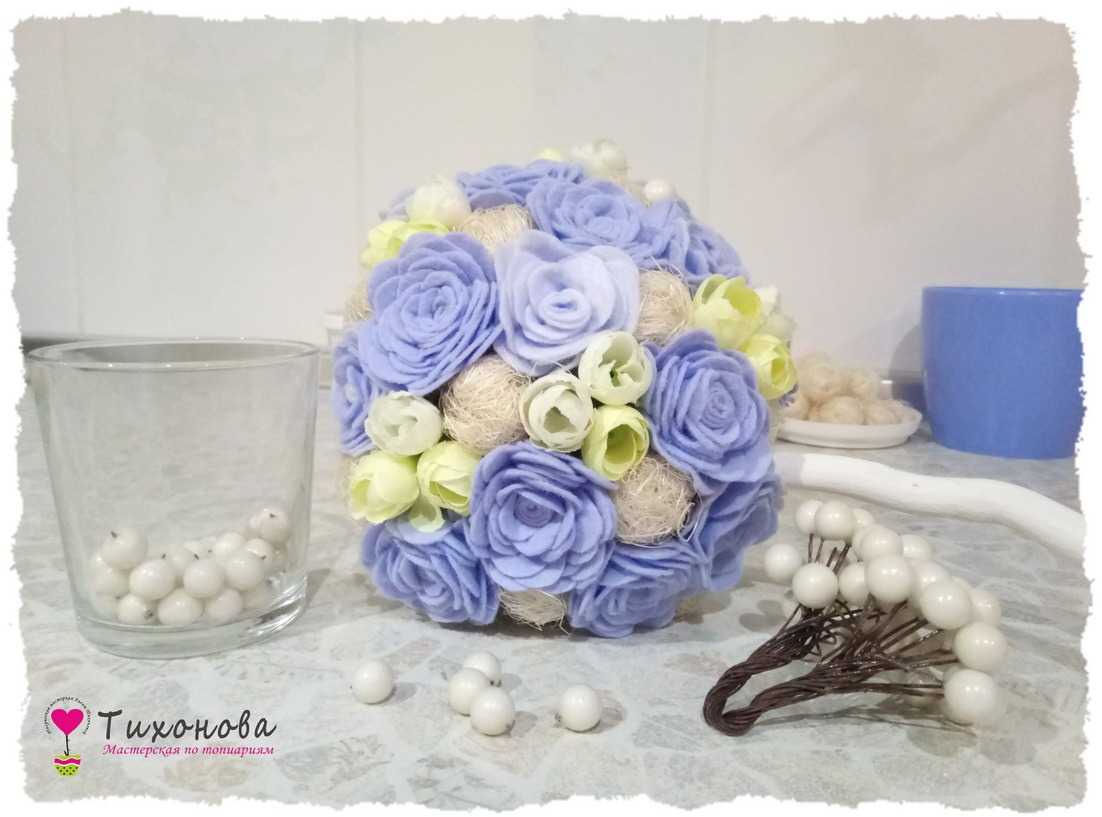 Шар оформляется заготовленными цветами. На нижнюю часть розы наносится клей и плотно прикладывается к поверхности основы.