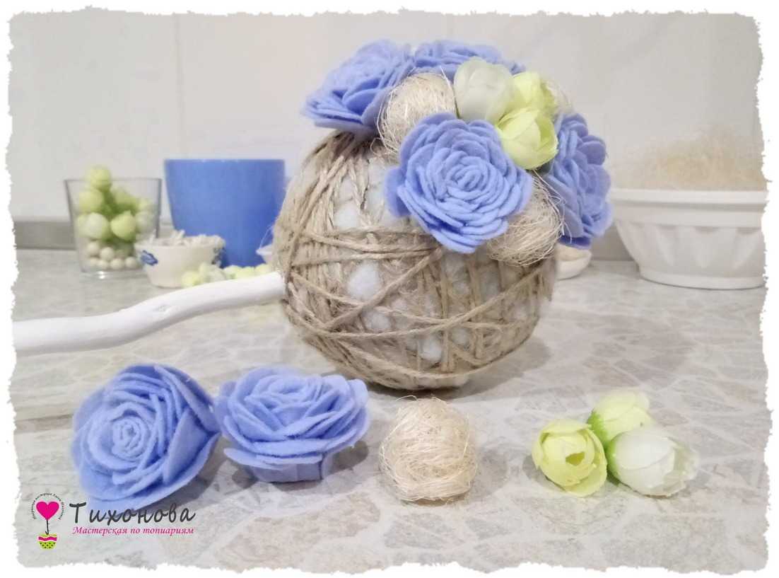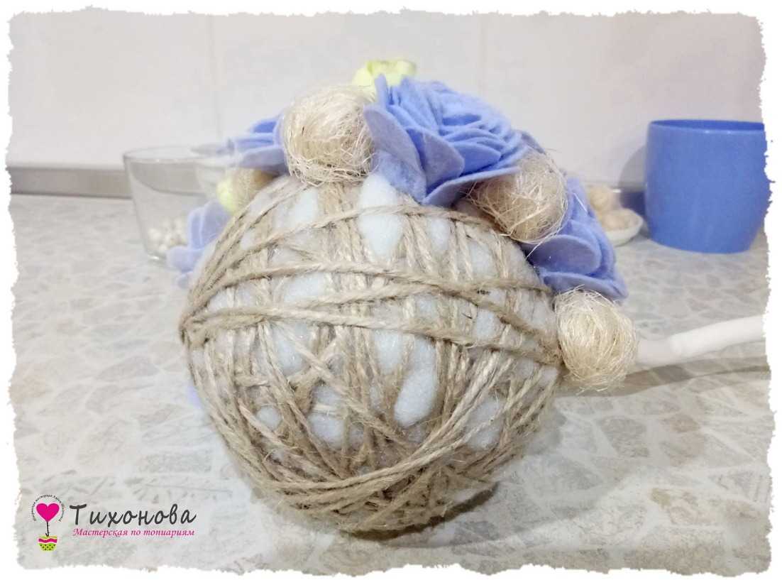 В хаотичном порядке по всему шару клеим шарики из сизаля, цветы из салфеток, искусственные розы и гладкие ягоды. Элементы располагаем кучно, без щелей, но в то же время так, чтобы розы и шарики не комкались.