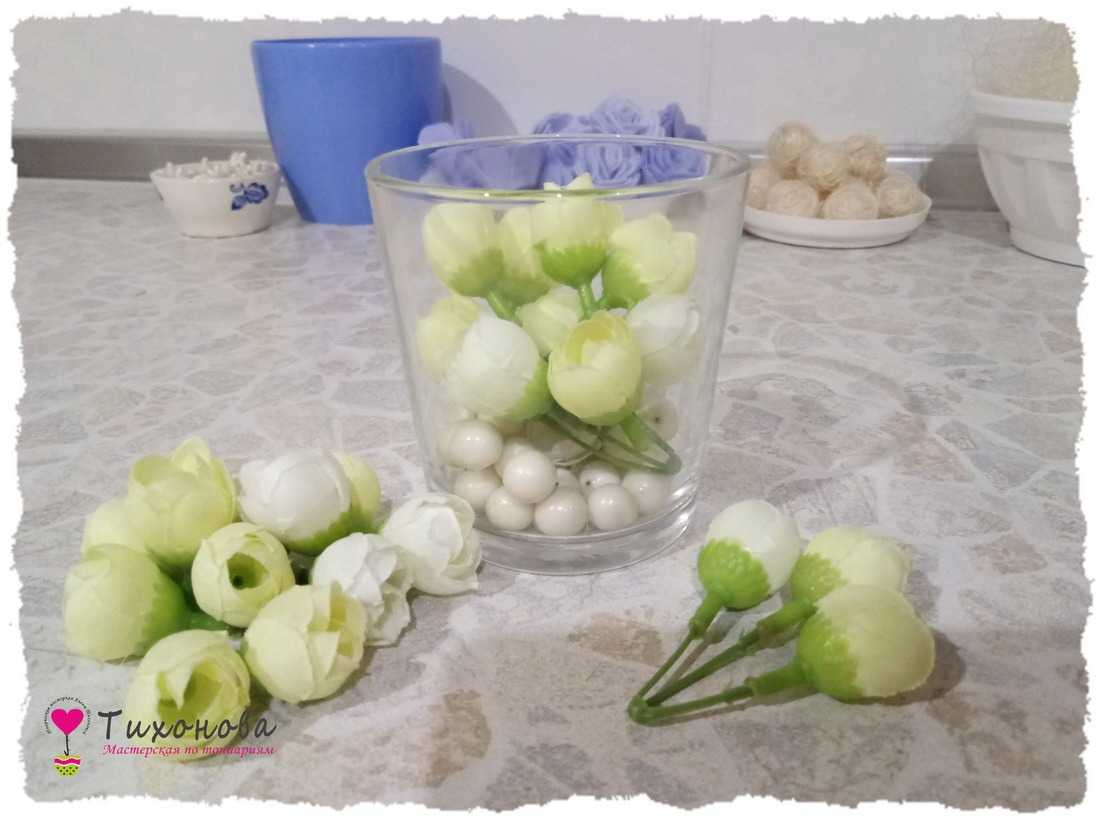 Для того чтобы закрыть просветы между ватными дисками, композиция дополняется искусственной листвой.