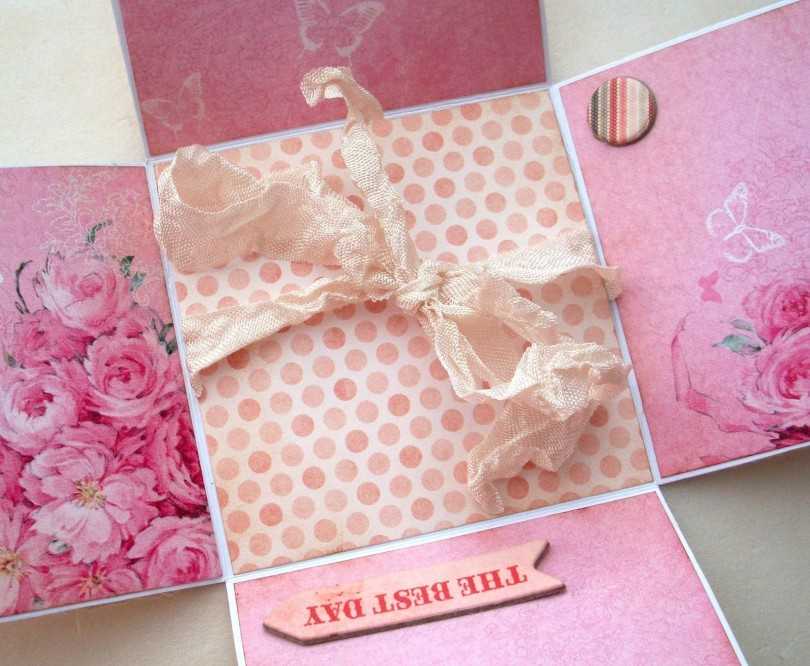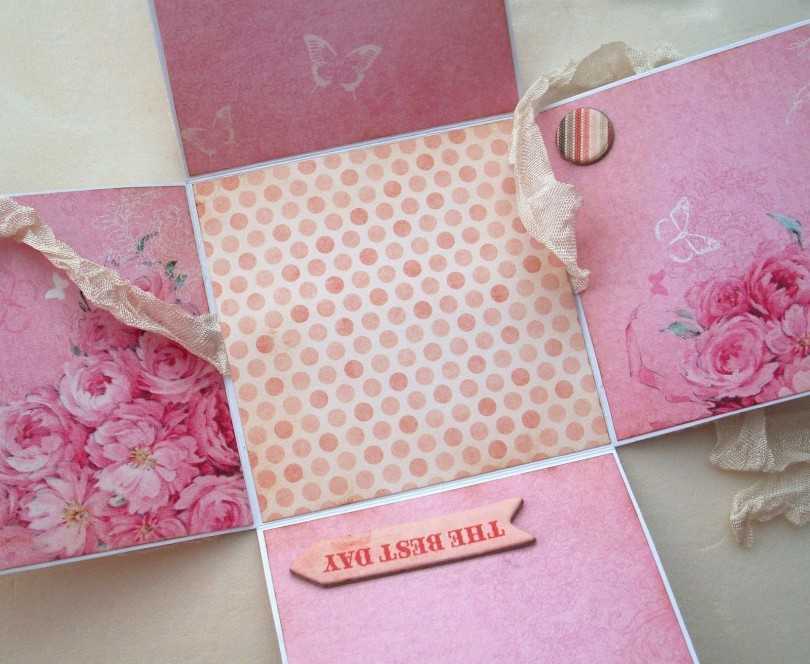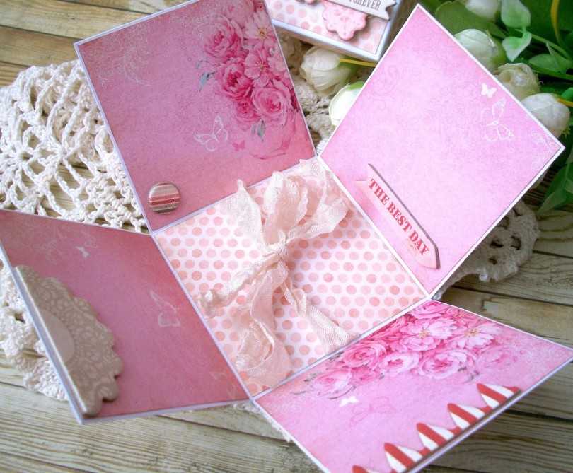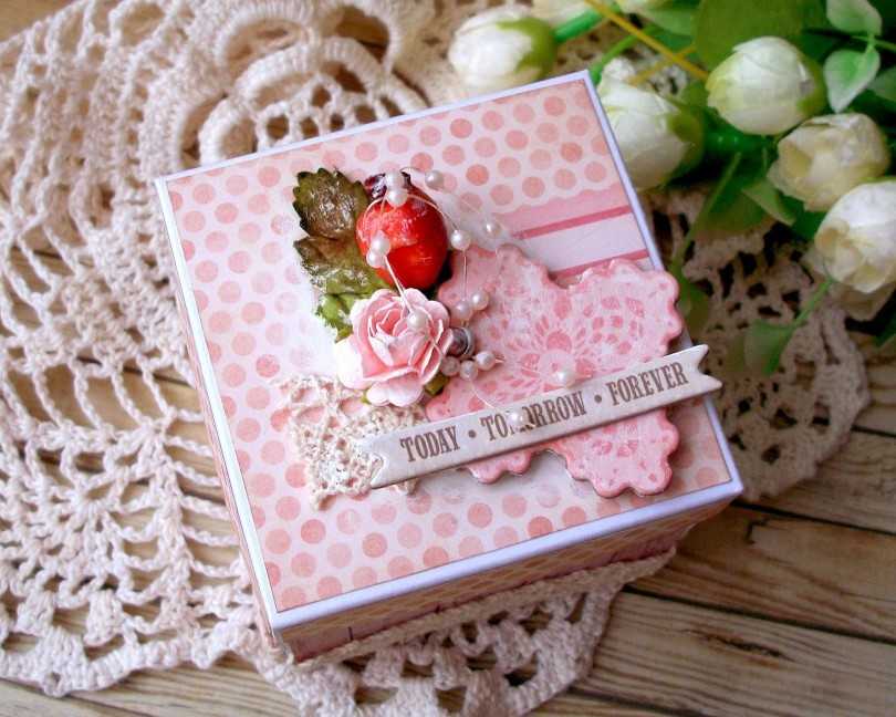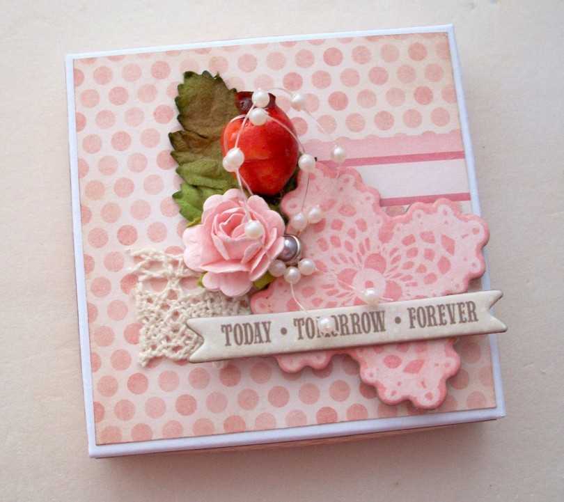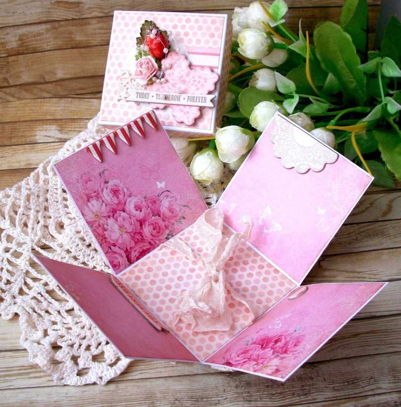 Следующая замечательная идея также выполнена в технике скрапбукинга. Коробочка с фотографиями своими руками делается следующим образом: