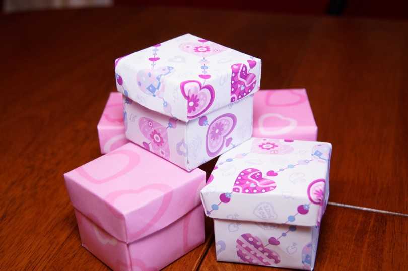 Презент прячется в маленькую коробочку. После этого все собирается по принципу матрешки. Для фиксации можно скрепить их цветной лентой и украсить бантом или милой открыткой с пожеланиями.