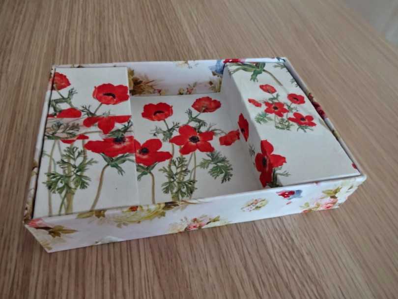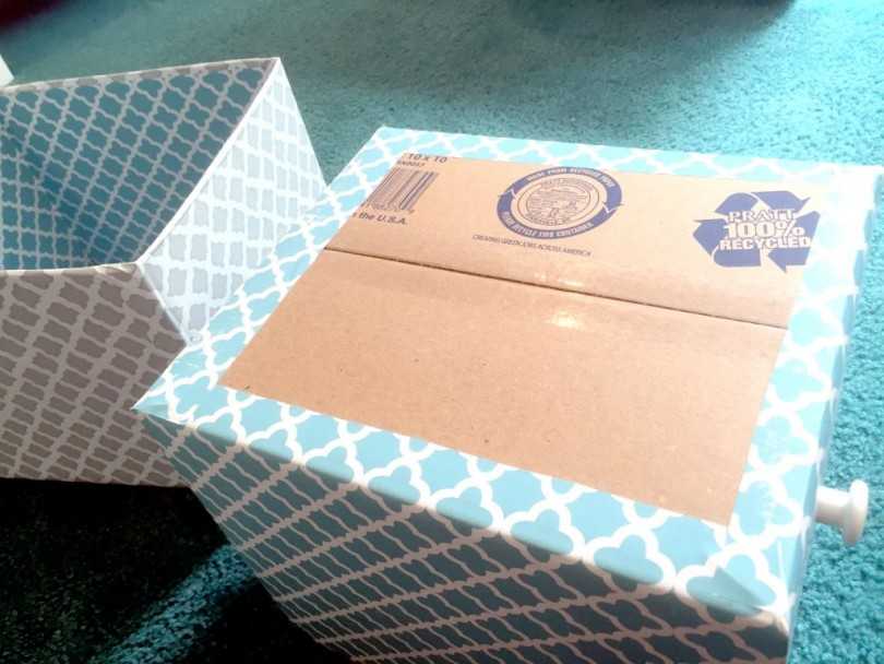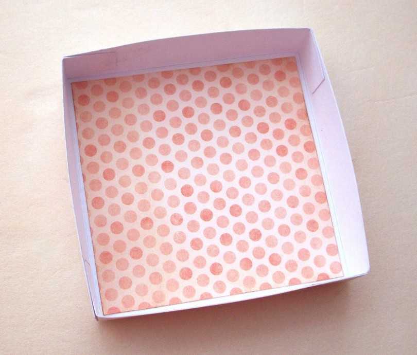 - Украшаем нашу крышку точно такой же бумагой, которую использовали ранее для внешней стороны коробки