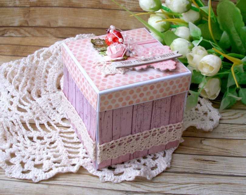 Примечательность данной коробки заключается в том, что для ее создания не требуется ни капли клея. Самым же подходящим материалом, из которого ее можно сделать, является плотная и очень красивые листы для скрапбукинга.
