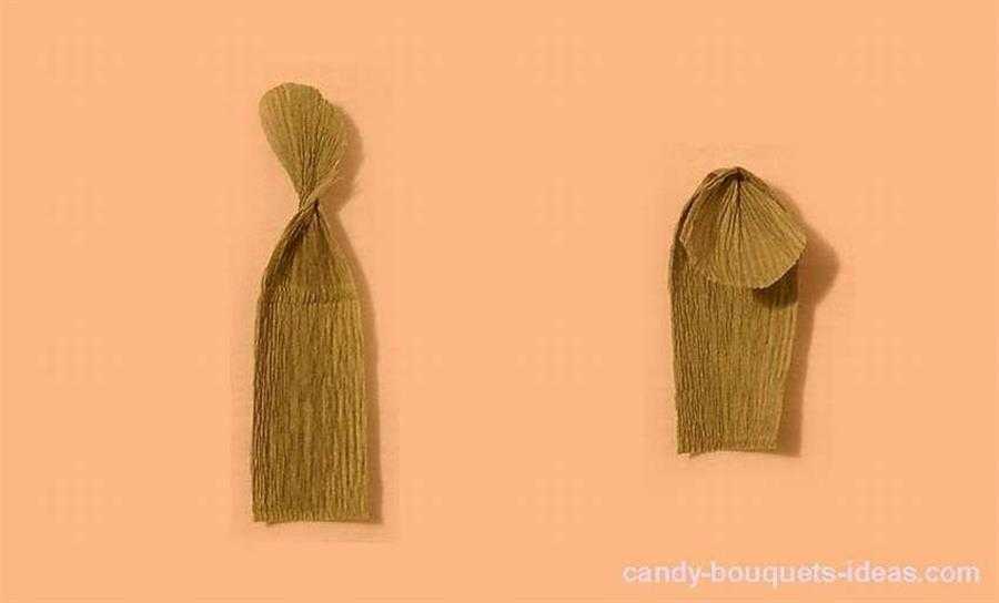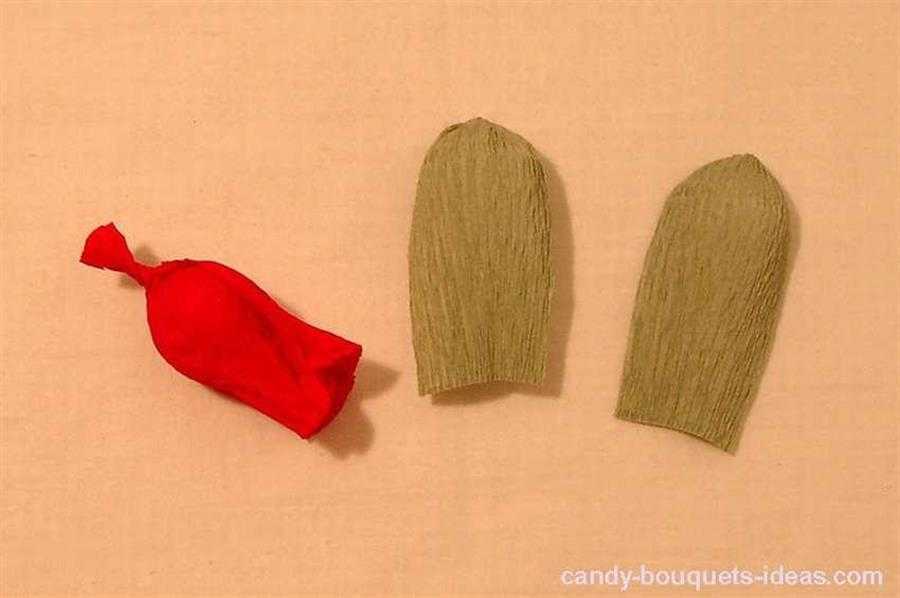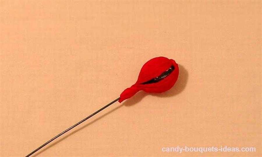 Расправив лепестки, вкладываем в один из них конфету, накрываем другим и скручиваем концы. Получаем не до конца раскрывшийся маковый бутон.