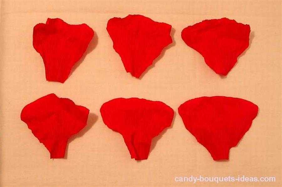 Теперь создаем лепестки мака. Для одного соцветия нам понадобится всего шесть лепесточков. Отрезаем от рулона гофрированной бумаги ленту шириной 4-5см. Далее отматываем примерно 30-35 см. ленты и отрезаем. Складываем отрезок в шесть раз. После чего вырезаем лепестки, примерно, вот такой формы.