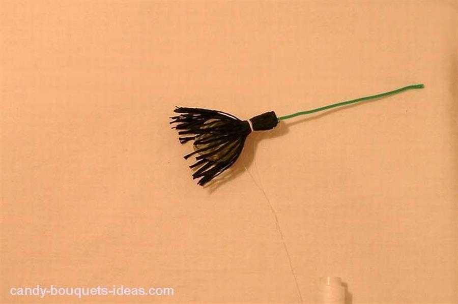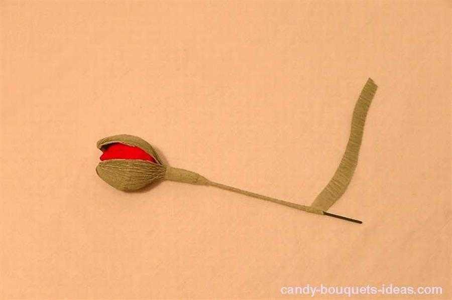 - От гофрированной бумаги отрежьте длинную полосу шириной 1 см. Обмотайте стебель бумагой, при необходимости добавляйте немного клея. Кончик закрепите внизу стебля.