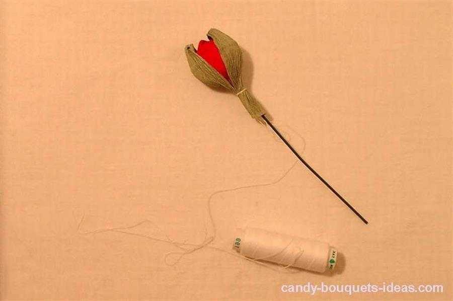 Перематываем весь стебель полоской зелёной гофрированной бумаги – и готово! Необычно, не правда ли?