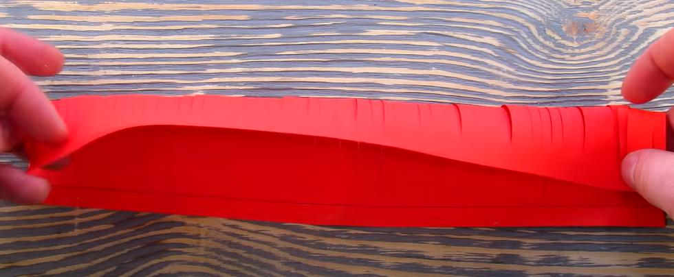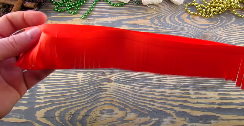 - Сложите трубочку двое. Ножницами прорежьте на полоски в половину длины заготовки.