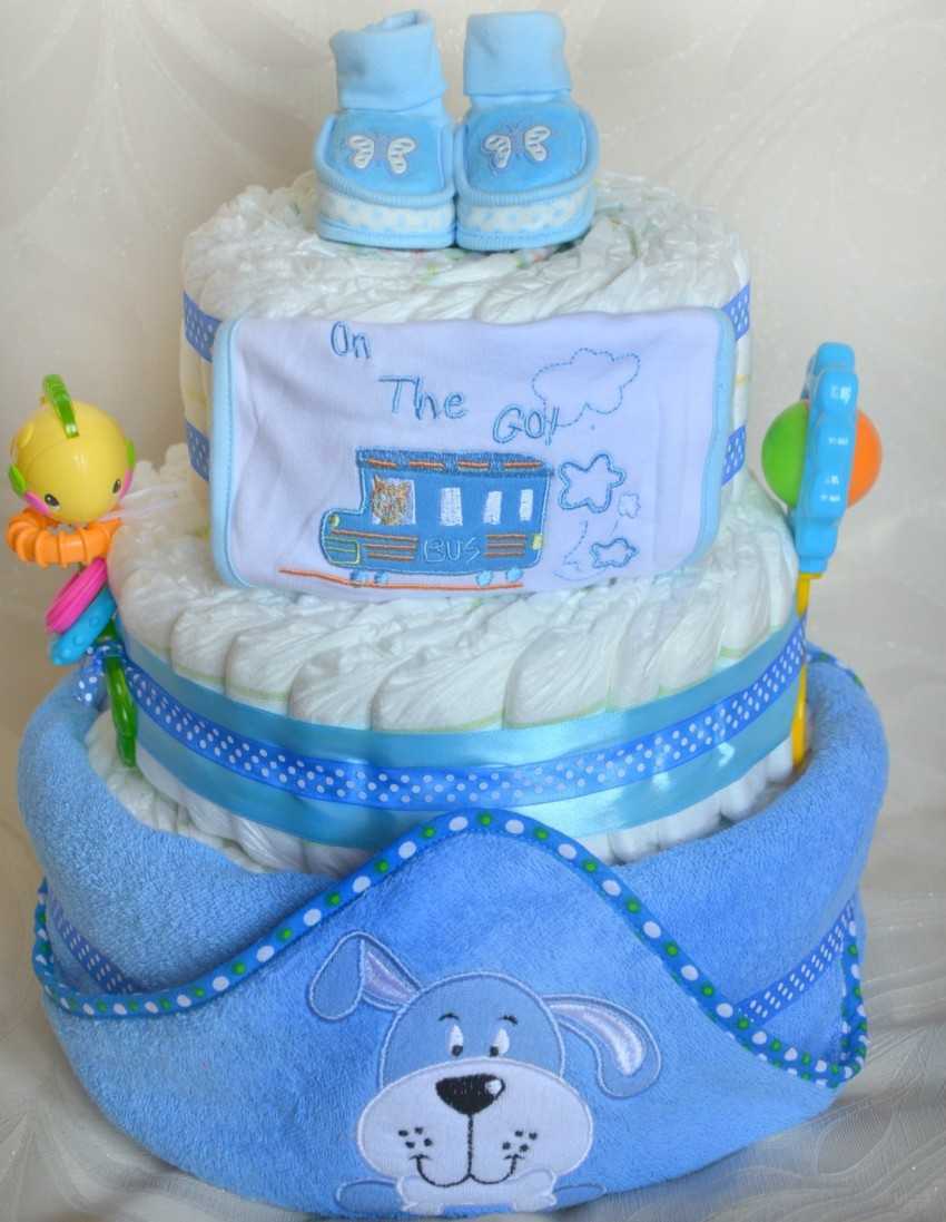 Мальчикам также можно вручить памперсный торт, но его нужно по-другому украсить. Собрать его можно из таких компонентов: