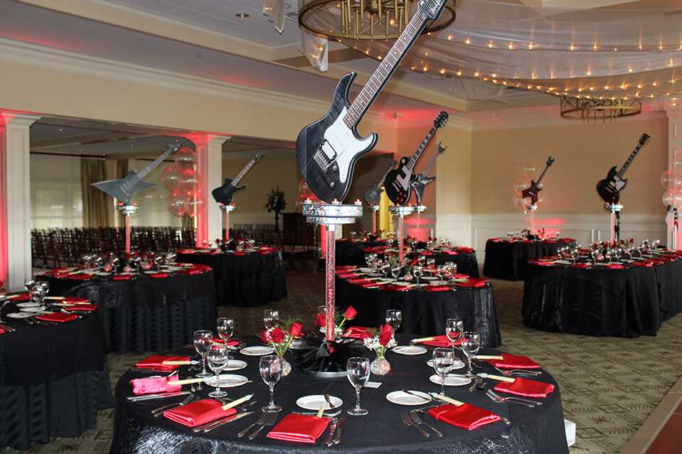 Оформление зала происходит в соответствующей стилистике. Всё должно быть в ярких тонах, сочетать разные стили и эпатаж. Разбавить интерьер помогут пресс-стена, музыкальная сцена, всевозможные виды электрогитар, цветные огни на танцполе, виниловые пластинки, плакаты с изображениями кумиров или символов, например рокерской «козы». Лучшей локацией для проведения будет помещение в стиле лофт.