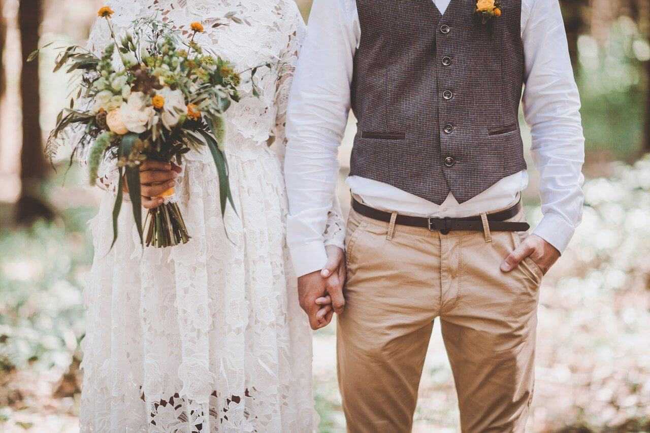- Одежда молодоженов. Образ невесты сделает идеальным элегантное приталенное платье белого или бежевого цвета. Оно должно быть драпировано воздушным кружевом или нежной вышивкой. Жених может быть одет в рубашку голубого цвета и песочные штаны на подтяжках.