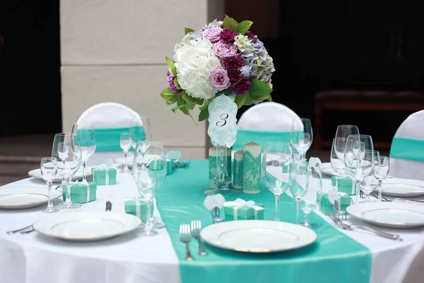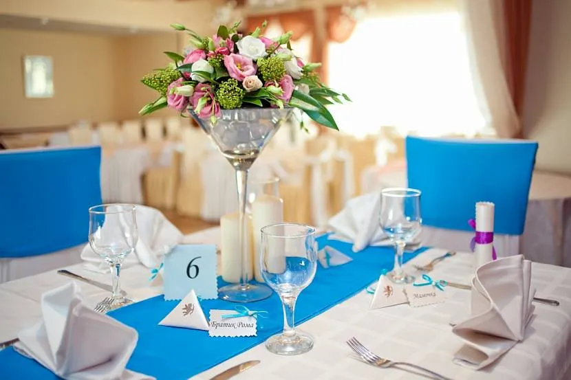 Гостевой столик в ярком бирюзовом декоре для гостейИсточник svadbadoiposle.com