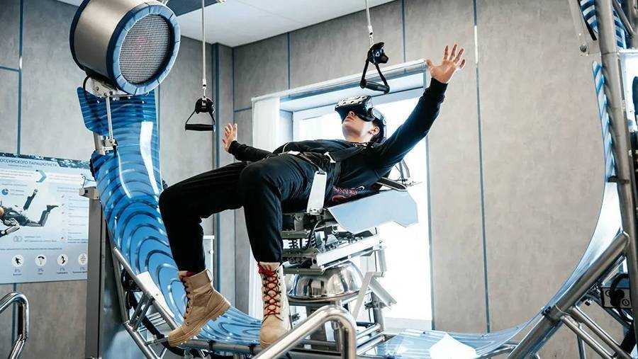 Но больше всего школьникам нравится тренажер, имитирующий свободное падение и приземление на управляемом парашюте. Обучающегося прикрепляют к системе ремнями, и он оказывается в подвешенном состоянии, обдуваемый мощными вентиляторами. В шлеме виртуальной реальности курсант видит перед собой приближающуюся землю. Его задача — аккуратно управляя парашютом типа «крыло», приземлиться на платформу движущегося грузовика. Получается не у всех, но на впечатления это не влияет, признаются молодые люди.
