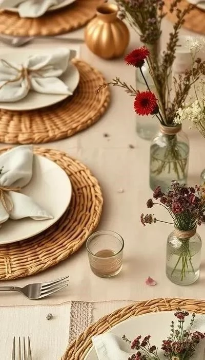 Цветочные гирлянды и свечи: Цветы – неотъемлемая часть бохо-декора. Используйте полевые цветы, сухоцветы, ветки деревьев и зелень для создания цветочных композиций и гирлянд. Свечи в подсвечниках из дерева, металла или стекла добавят романтики и загадочности. Разместите свечи на разных уровнях, чтобы создать игру света и тени.