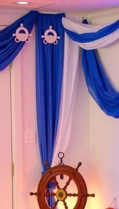 Добавьте спасательные круги разных размеров и цветов, размещая их на стенах или подвешивая к потолку. Используйте сетки, украшенные морскими звездами и ракушками, для создания эффекта морского дна. Разместите декоративные якоря, как напольные, так и настенные. Не забудьте о картинах с морскими пейзажами или изображениями морских обитателей. Используйте синие и белые воздушные шары, оформляя их в виде морских животных или кораблей.