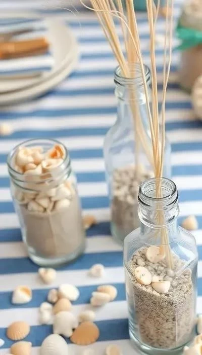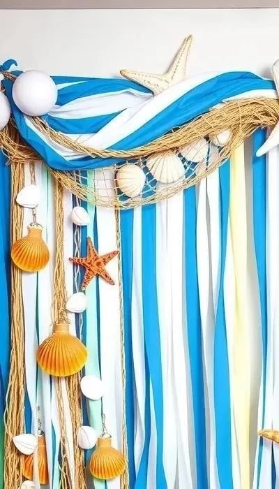 Превратите ваше пространство в морскую сказку! Используйте сине-белые ткани для драпировки стен, создавая эффект морской волны. Развесьте гирлянды из ракушек, жемчуга и морских звезд, добавляя атмосферу пляжа. Расставьте бутылки с песком, ракушками и миниатюрными кораблями внутри, создавая морские пейзажи. Завяжите декоративные морские узлы из джутовой веревки, развешивая их на стенах или потолке.