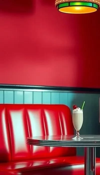 Для оформления используйте яркие цвета: красный, розовый, бирюзовый и черный. Добавьте неоновые вывески, виниловые пластинки, постеры с изображением звезд 50-х и ретро-автомобили (даже их картонные копии!). Создайте уголок, напоминающий американский дайнер, с клетчатыми скатертями и высокими стульями.