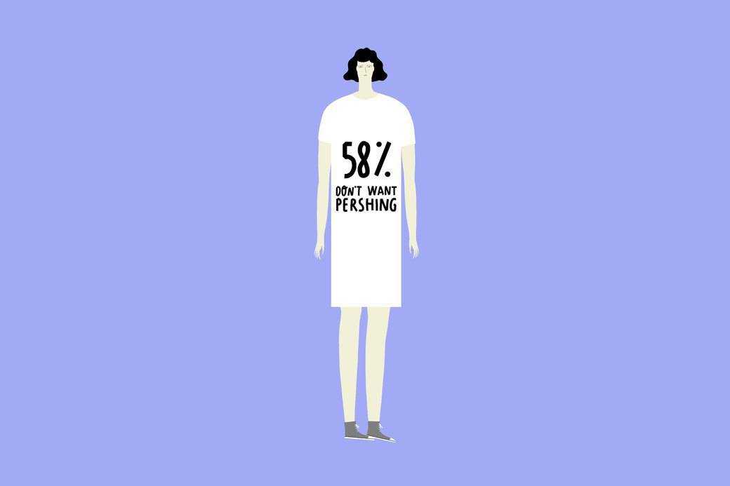 Маргарет Тэтчер — первая женщина, занявшая пост премьер-министра европейского государства — души не чаяла в ядерном оружии. В то время как большая часть британцев выступала против увеличения ядерного потенциала страны, Железная леди соглашалась с Рейганом не только на медленные танцы, но и на размещение ракет малой дальности «Першинг-1А» на военно-воздушной базе США в английском Беркшире. Тогда дизайнер Кэтрин Хэмнет решила выступить в качестве представителя общественного мнения: заявилась на официальный прием к премьер-министру в майке-платье собственного дизайна и буквально ткнула Тэтчер в лицо факт «58 % DON’T WANT PERSHING». Снимок встречи облетел все СМИ — так мир узнал, что большинство жителей Объединенного Королевства не поддерживают решения Тэтчер.