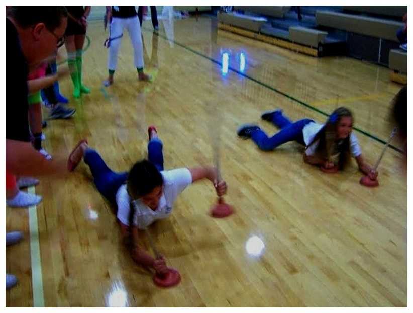 Участники должны пройти дистанцию с помощью подручных средств, например, зажав шарик между ног, надев обувь на руки, выложив две доски, двигаясь на двух вантузах и т.п.